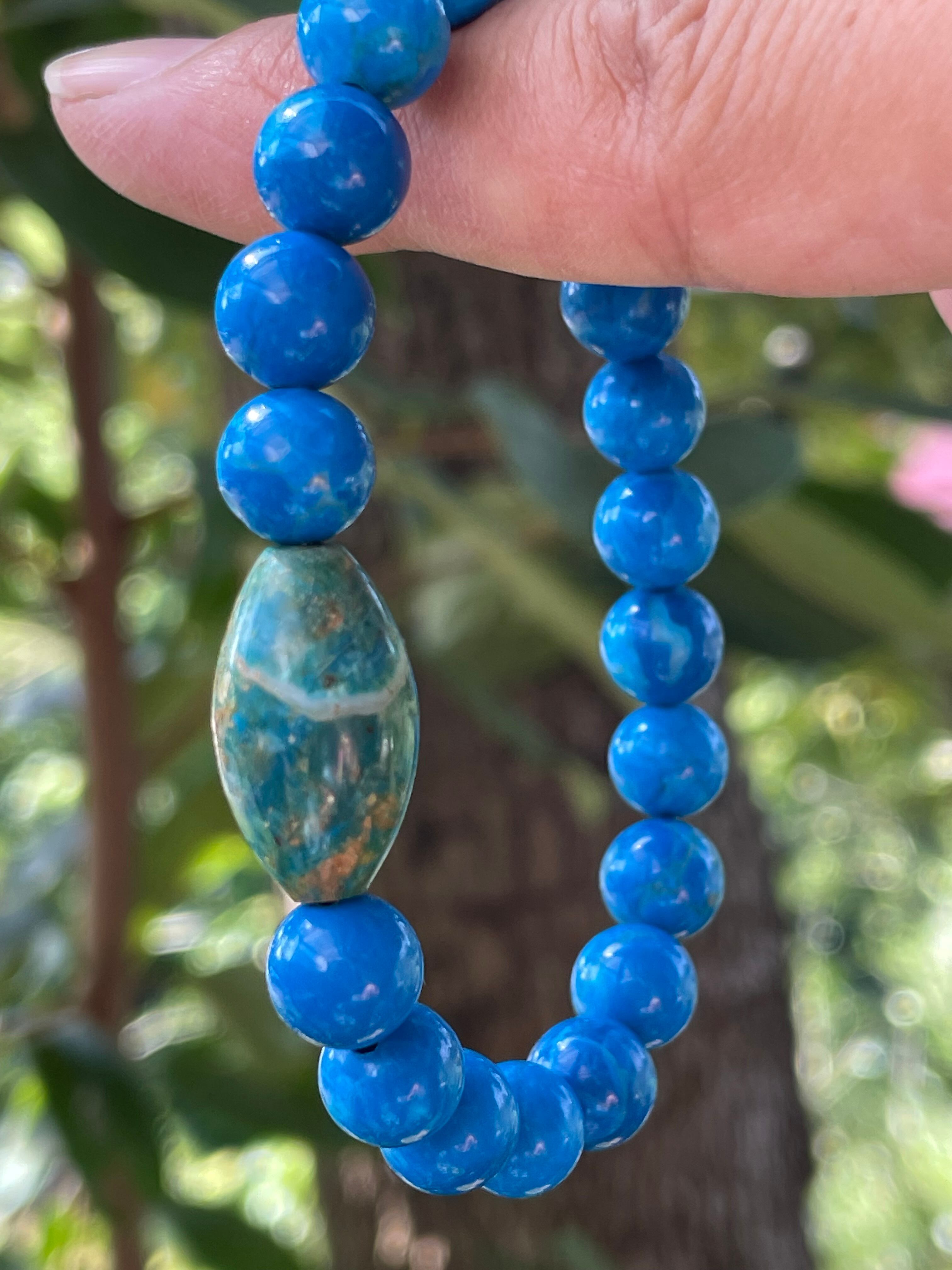 鮮やかなブルーのマグネサイトターコイズとは、白色のマグネサイトという石を染色して、ターコイズ(トルコ石)のような青色や緑色に似せた人工処理石のことです。本物のターコイズよりも手頃な価格で、安定した色合いが特徴です。