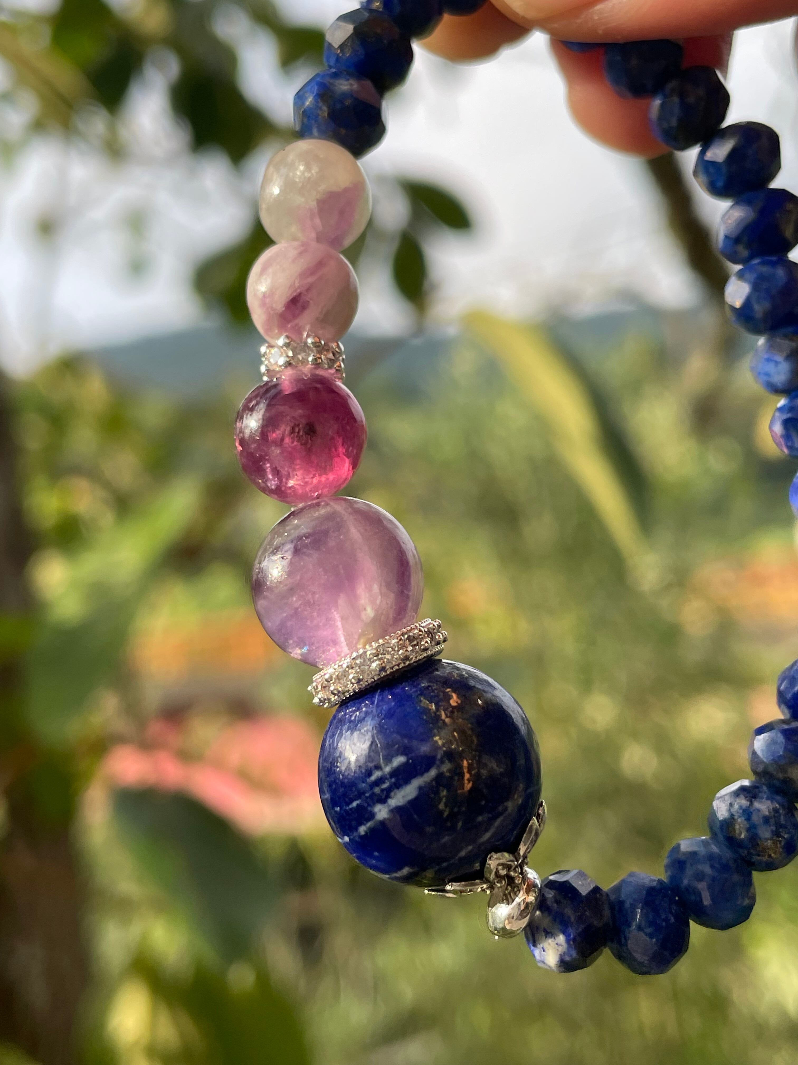 ラピスラズリの高貴で神聖なイメージに合わせて、グラデーションのキレイなブルーエンジェルフェザーフローライトを合わせました。夜空のような深みのあるデザインブレスレットです。