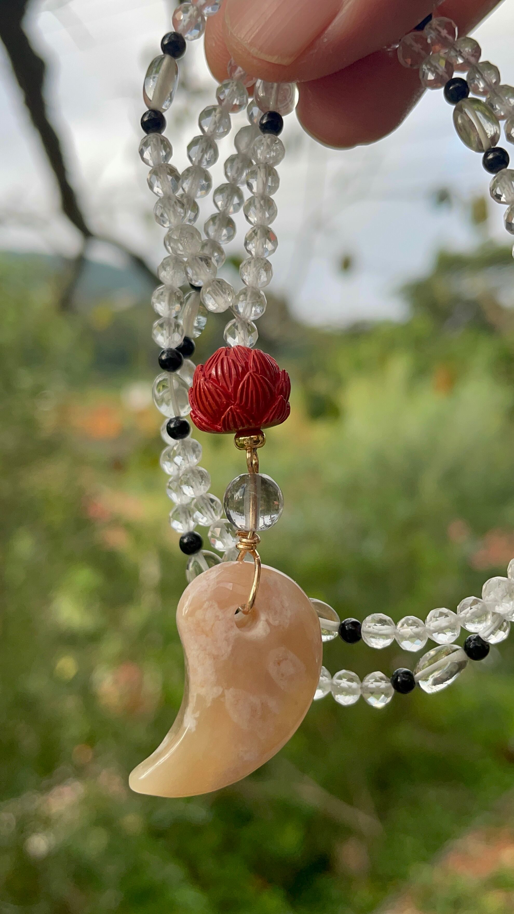 ミラーボールカット水晶に、オニキスとアクアマリンのタンブルを合わせた、桜メノウの勾玉ネックレス。